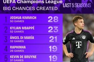 体育资讯9月7日讯 squakwa统计了近5个赛季的欧冠创造重大机会情况,拜仁中场基米希独自领跑,B费的效率则是前十最高。