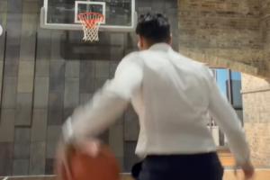 体育资讯10月26日讯 今日,ESPN名记Shams晒出自己在连续工作14个小时之后西装革履运球&投篮的视频。
